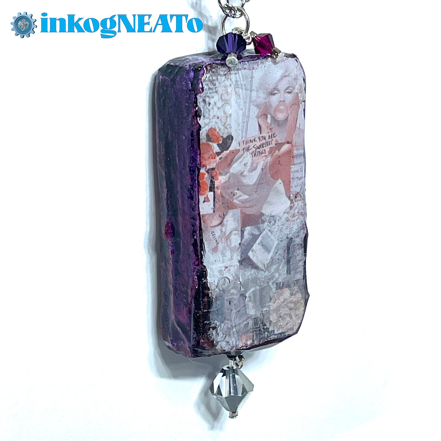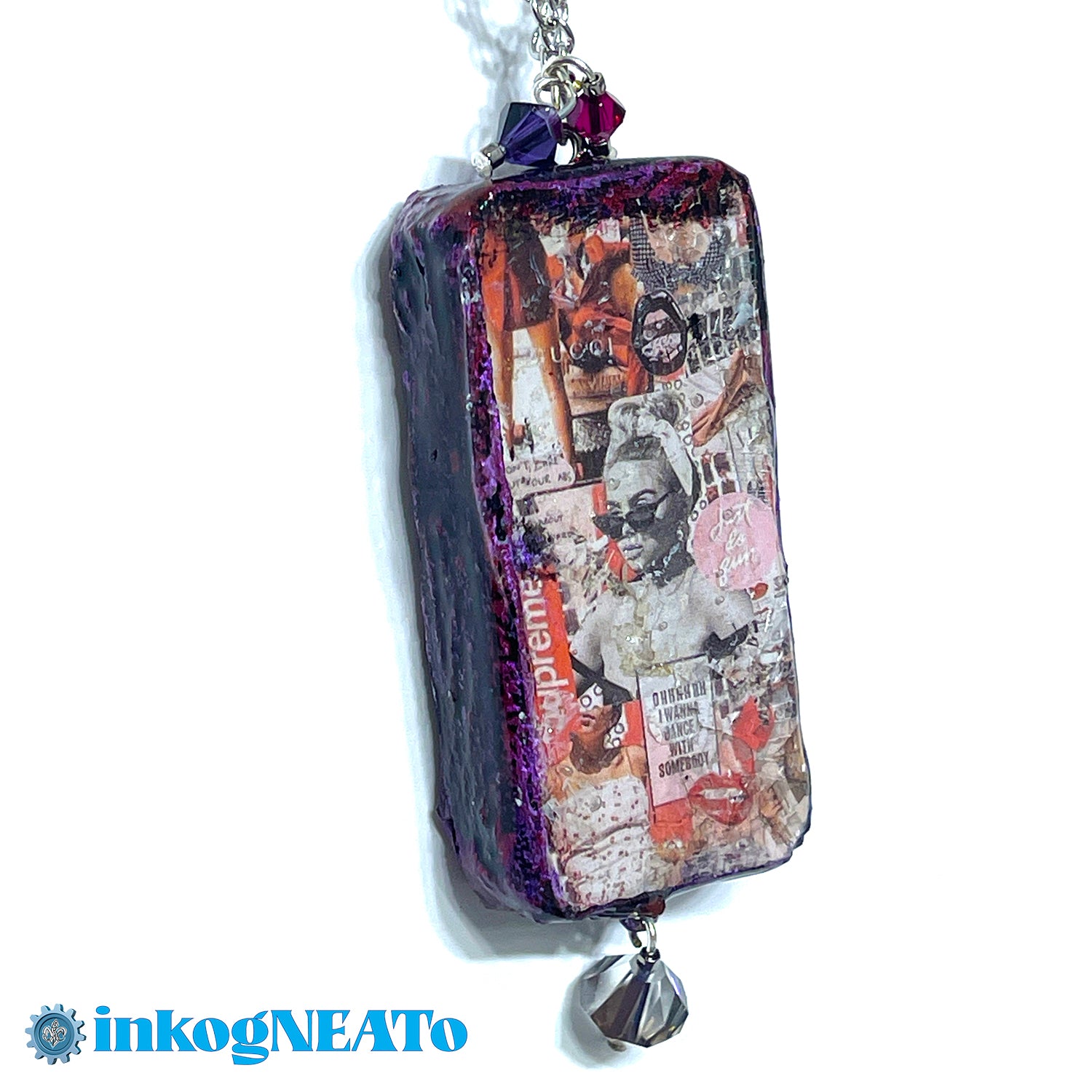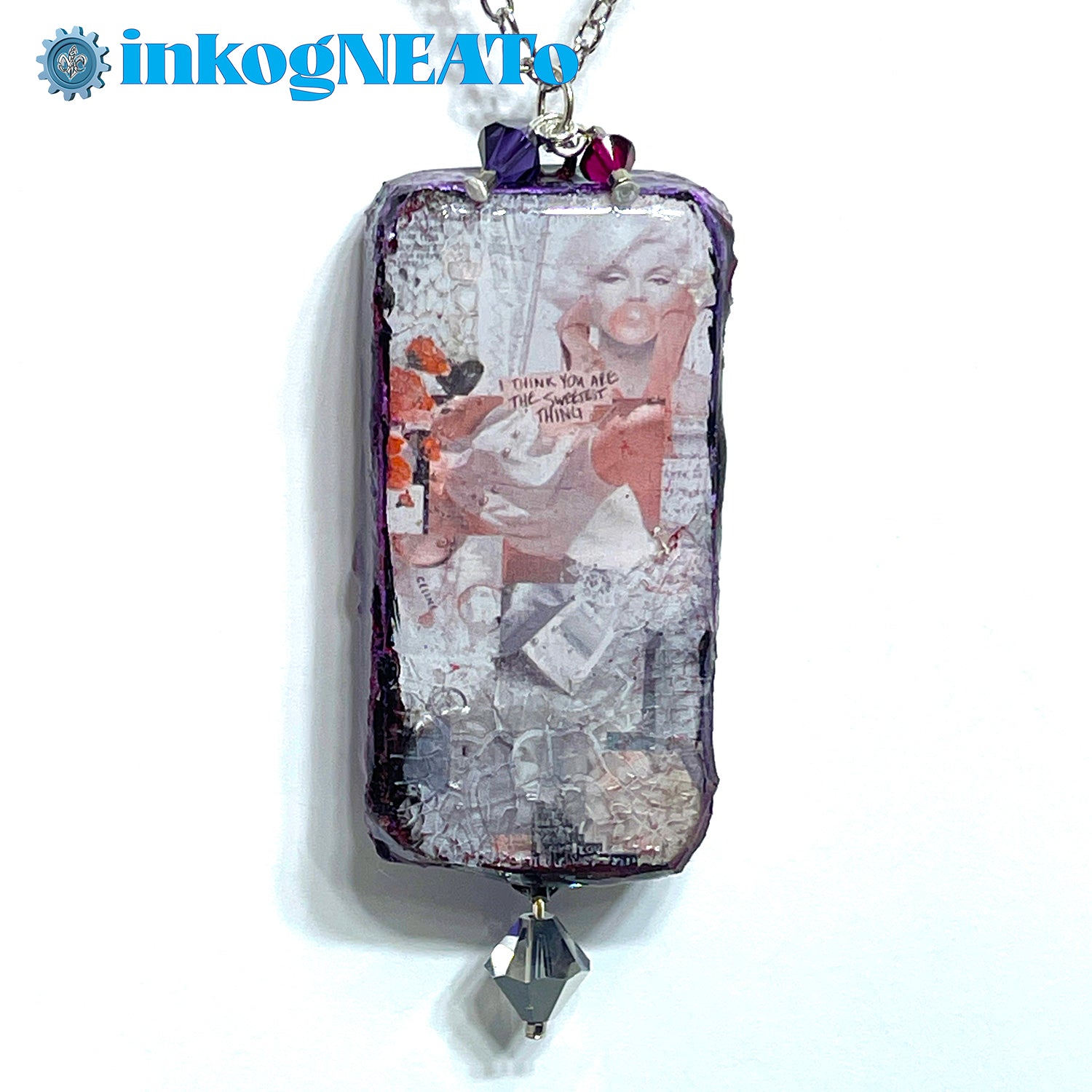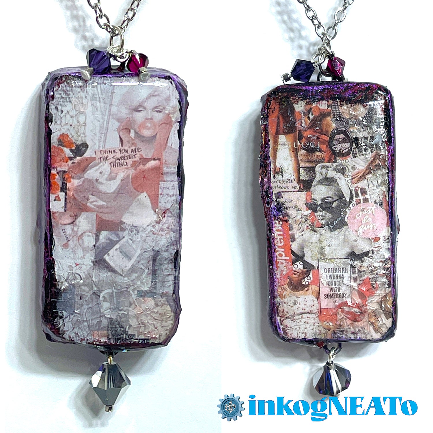 DUO Marilyn & Audrey features printed backgrounds with a beautiful crackle finish with added texture on the sides that wraps around the edges to the front and backside of the piece with brilliant turquoise highlights. One side features Marilyn Monroe while Audrey Hepburn is on the opposite side. Embellished with Swarovski crystal highlights at the top and bottom in coordinating colors.