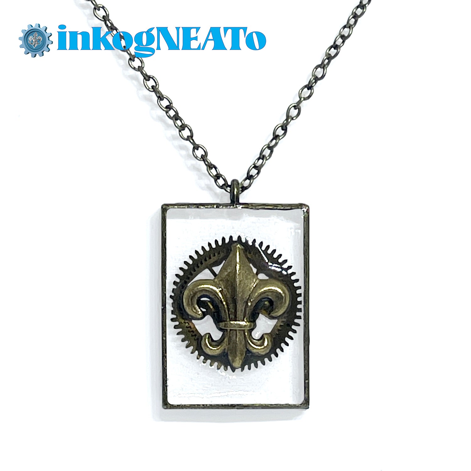 Fleur de Gear combines found objects to create a clean and simple necklace. The antique brass open back bezel is set with multiple layers of resin, which holds the Fleur de Lys inside of the upcycled clock gear. The bezel hangs from an antique gold chain.