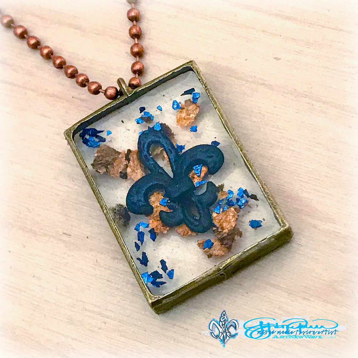Add style to your next outfit with this simple antique gold open backed bezel featuring a metallic blue fleur de lys set in resin with coordinating metallic blue German Glass and metallic copper mica flakes. This bezel measures 1 x 1⅜ inches (2.5 x 3.5 cm), hanging from a copper ball chain measuring 22 inches (56 cm) in length.