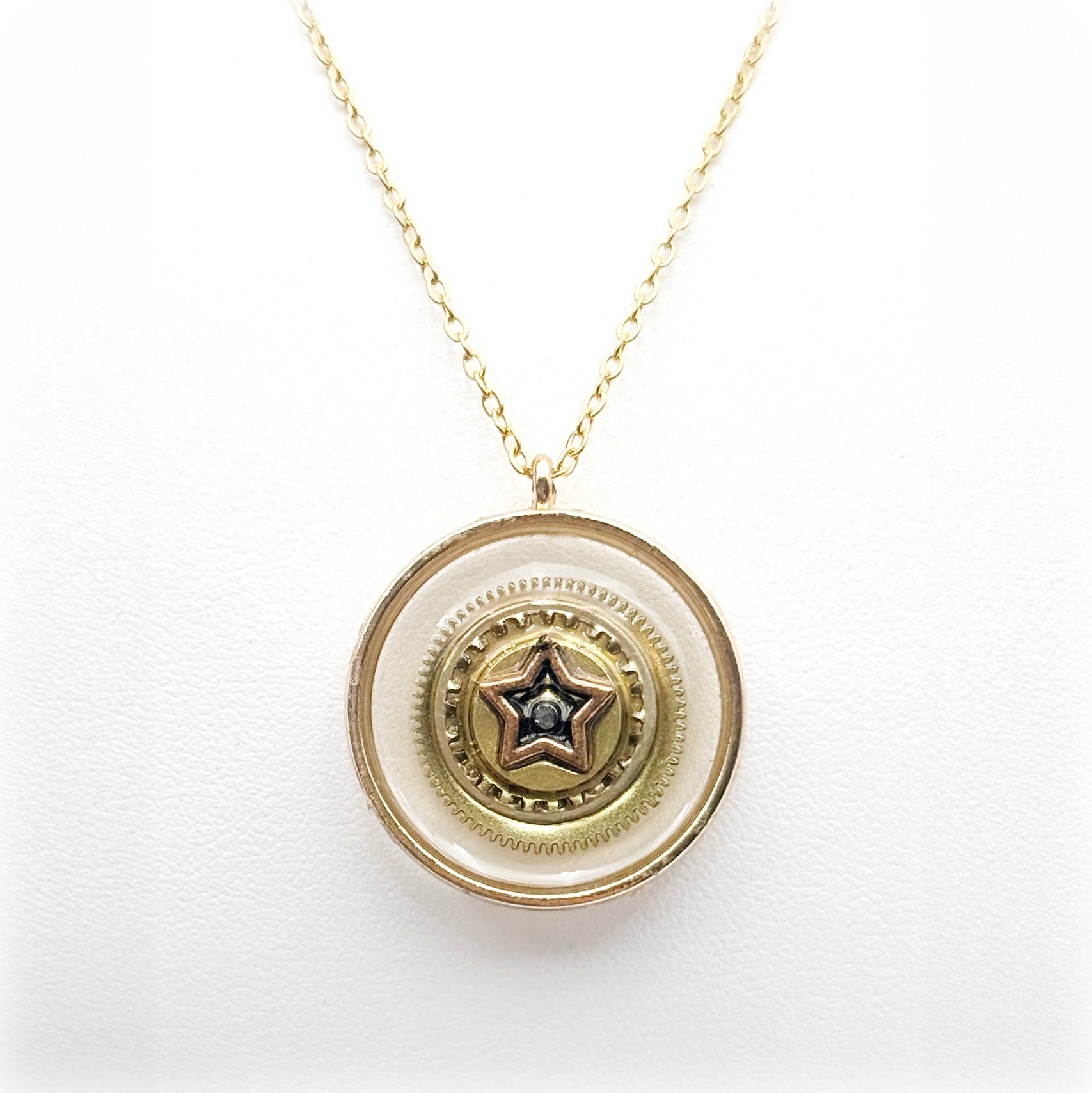 A miniature constellation you can wear. This round brass pendant centers on a stacked arrangement of vintage watch gears, radiating industrial elegance with a sense of cosmic order. At the heart, a brass and copper star is encased like a relic from some imagined orbit, equal parts steampunk and celestial. It’s mechanical, yes — but there's stardust in its bones.