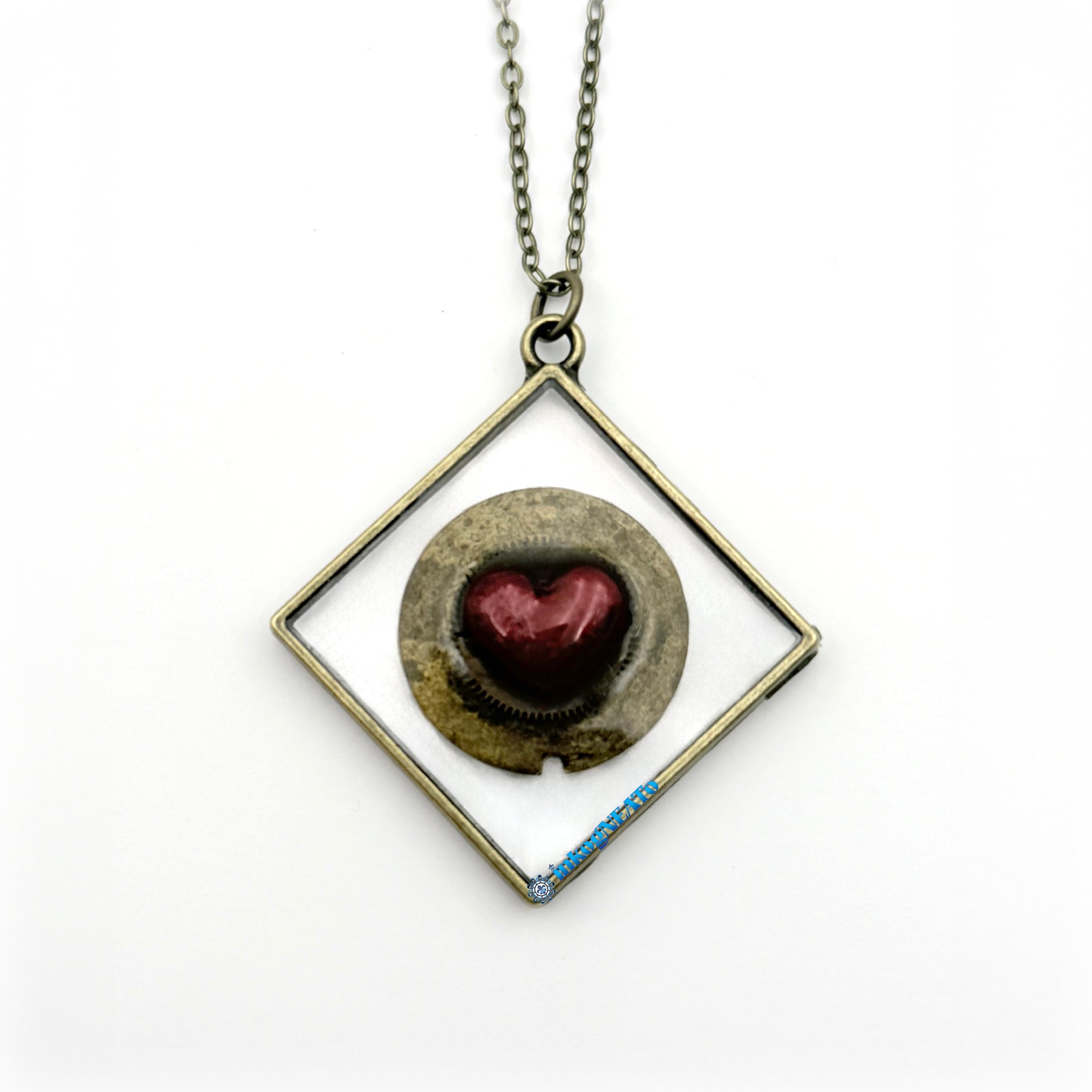 At the heart of this piece lies contradiction, the kind that defines so many of us. A vibrant scarlet heart, handmade from paper clay and painted with metallic hues, beats visibly within the confines of a weathered, industrial clock gear. Encased in a clear resin and framed in a diamond-shaped antique brass bezel, this necklace speaks to the beauty of pressure—how time, grit, and wear shape the strongest, most vibrant parts of who we are.