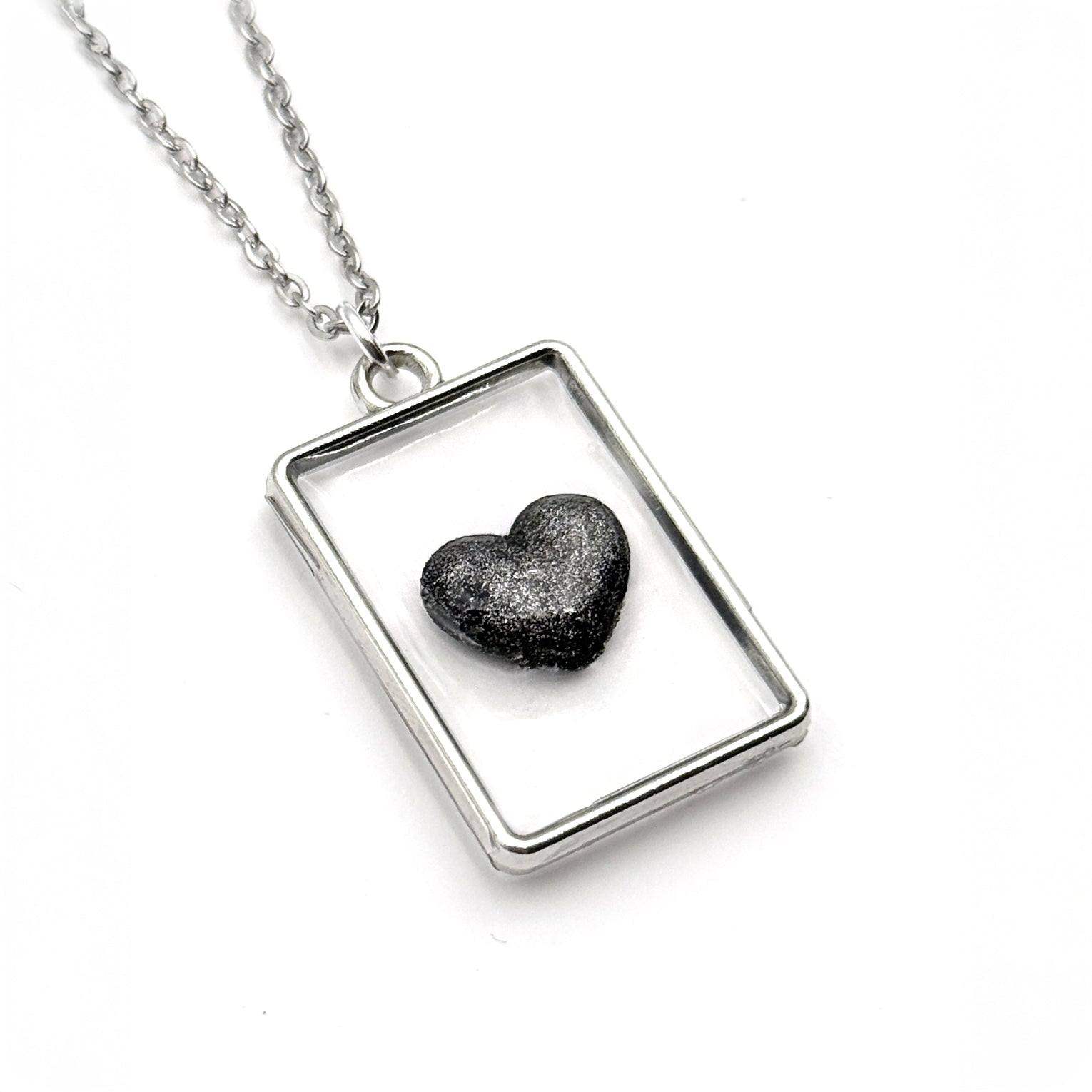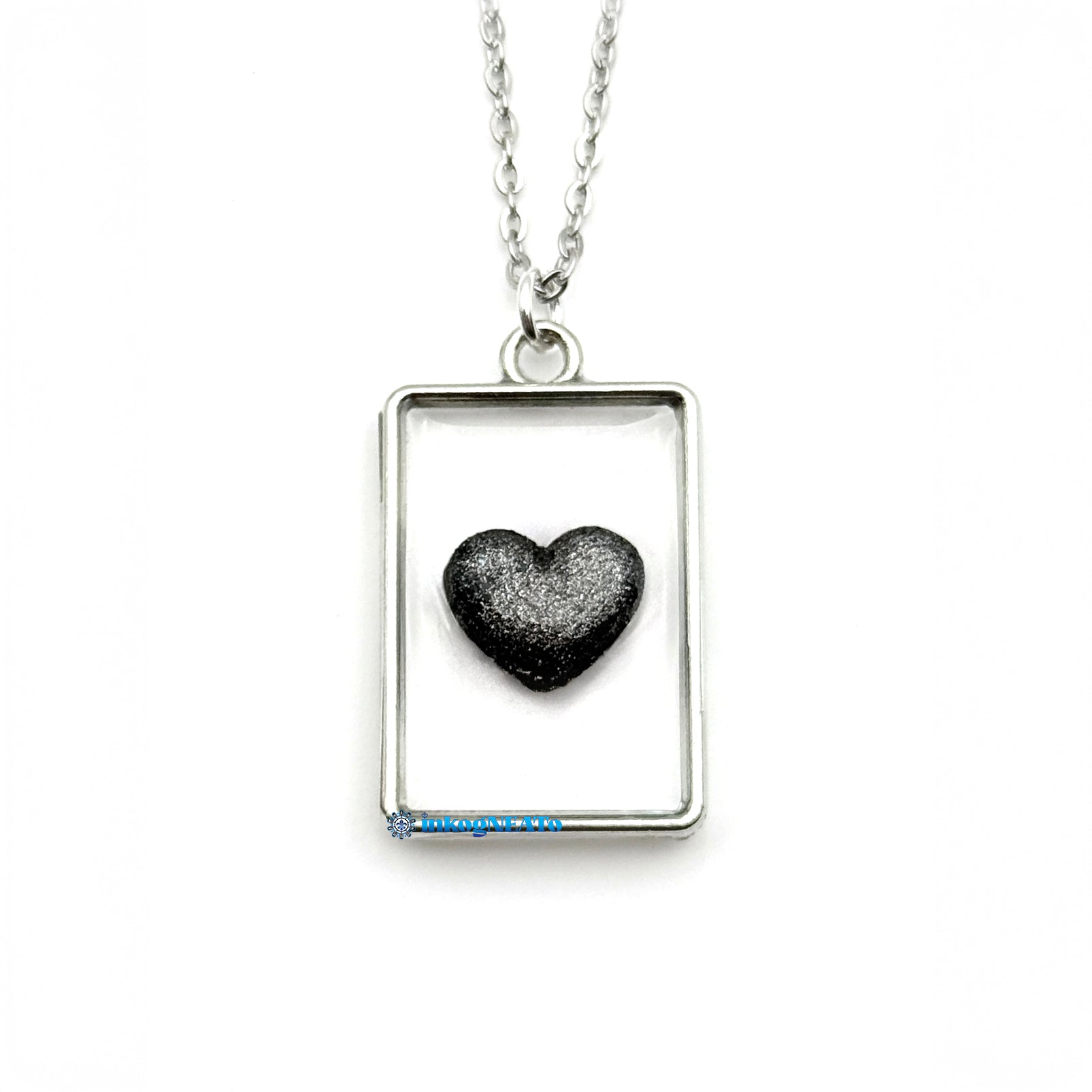 A small but commanding presence, this pendant captures the essence of contrast, delicate form meets dark intensity. Nestled in a minimalist silver rectangle, the hand-sculpted heart gleams in a moody black shimmer, like obsidian caught in a beam of light. It’s the kind of piece that doesn’t need to shout to be heard — it carries its weight in silence, resilience, and undeniable style. A quiet rebel’s charm in wearable form.