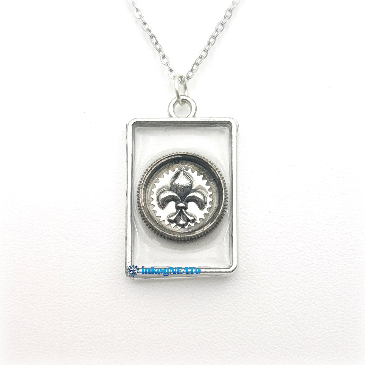 A timeless symbol of elegance meets steampunk grit in this striking mixed media fusion necklace. Set inside a silver finish rectangular bezel, a detailed silver fleur de lys is embedded in layered upcycled clock gears, creating the illusion of mechanical royalty. The contrast between sleek silver and aged industrial elements gives it a modern regal vibe. The perfect accessory for rule breakers, creatives, or anyone marching to their own drum.