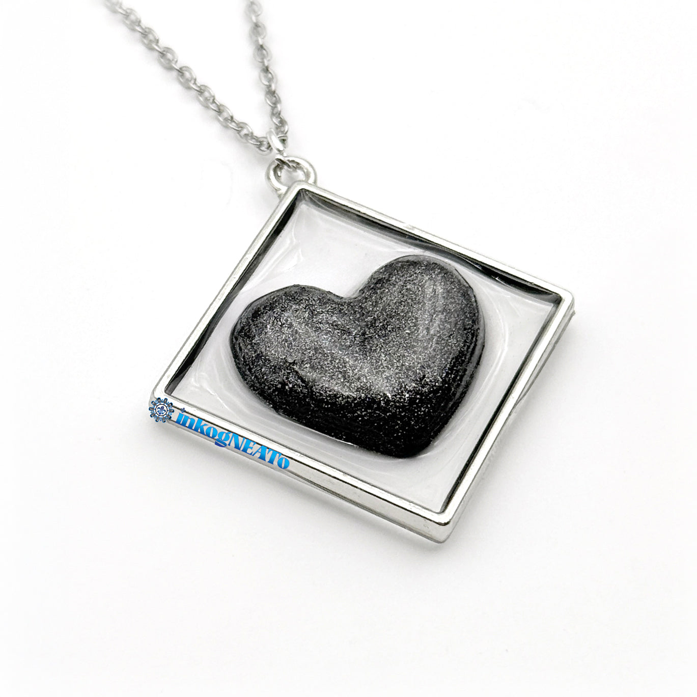 DETAILS: Black shimmer hand sculpted heart set inside of a silver mixed metal bezel with resin