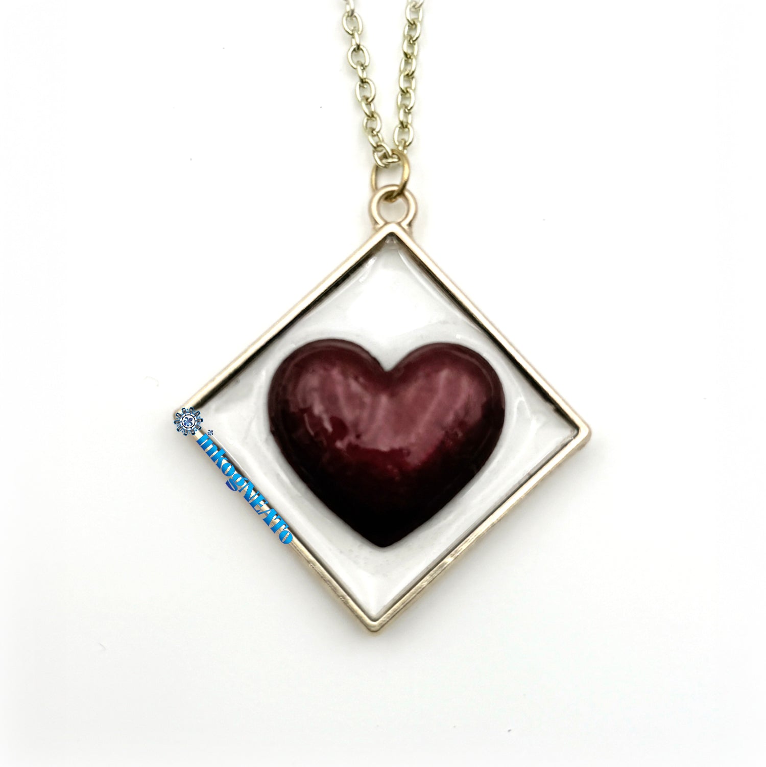 There’s something smoldering beneath the surface of this scarlet beauty. Burning Heart brings together fire and finesse — a handmade metallic red heart suspended in a brass toned diamond bezel, like a relic of deep emotion frozen in time. The color dances between crimson and garnet depending on the light, bold yet elegant, passionate without apology. Perfect for anyone who wears their heart not on their sleeve, but front and center.