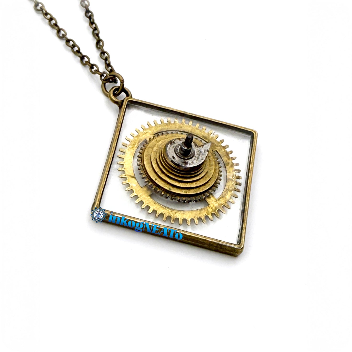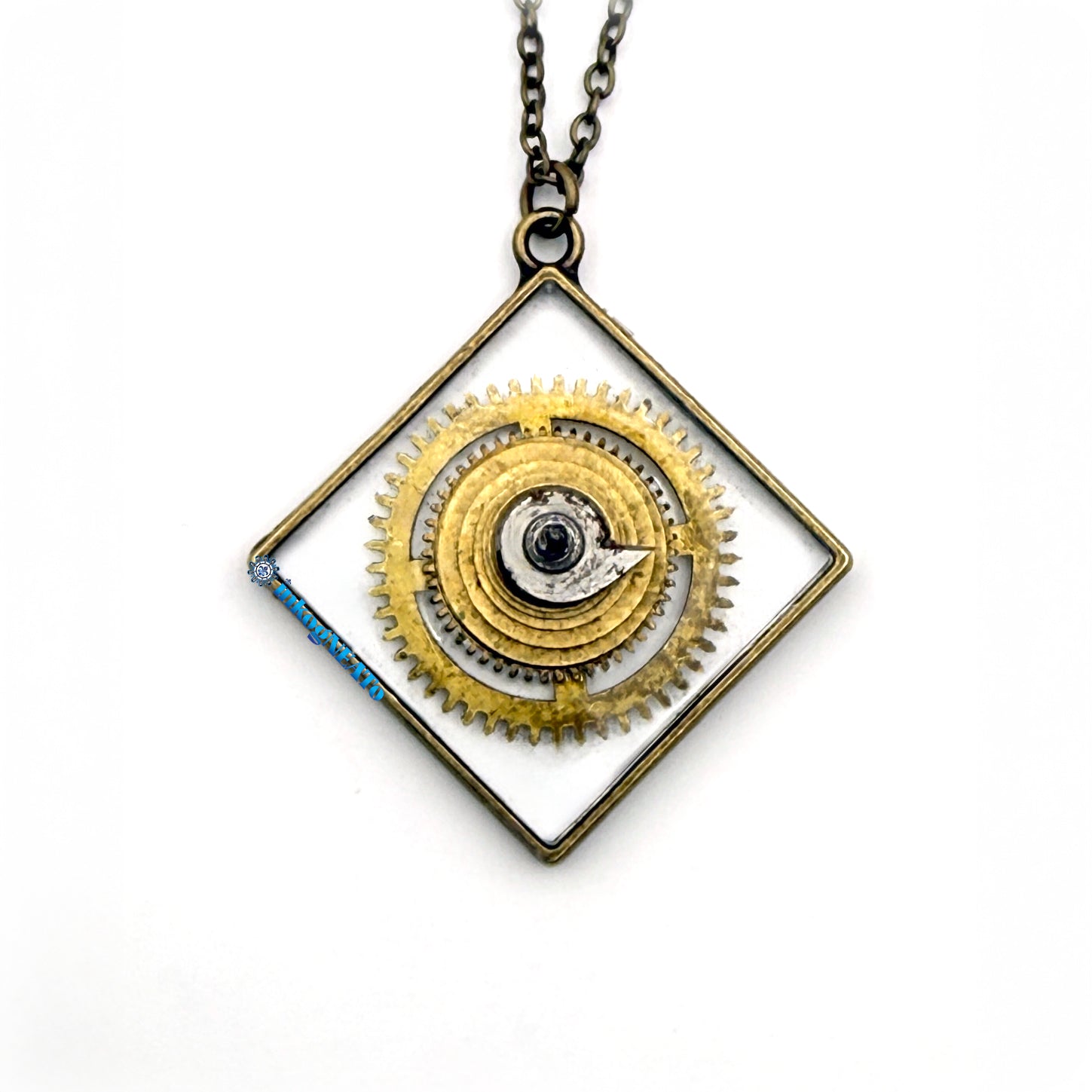 A striking collision of grit, grace, and mechanical mystery, Time Unwound is built around a hypnotic tower of stacked vintage clock and watch gears, layered like relics in a forgotten time capsule. The focal point is a dimensional spiral of brass and steel components that rise from the bezel like a crown of chaos, bold and unapologetically raw. Housed in a large antique brass diamond-shaped frame, this pendant is a testament to industrial decay made beautiful, where entropy becomes elegance. Suspended on a brass chain, it doesn’t just suggest movement — it commands it.