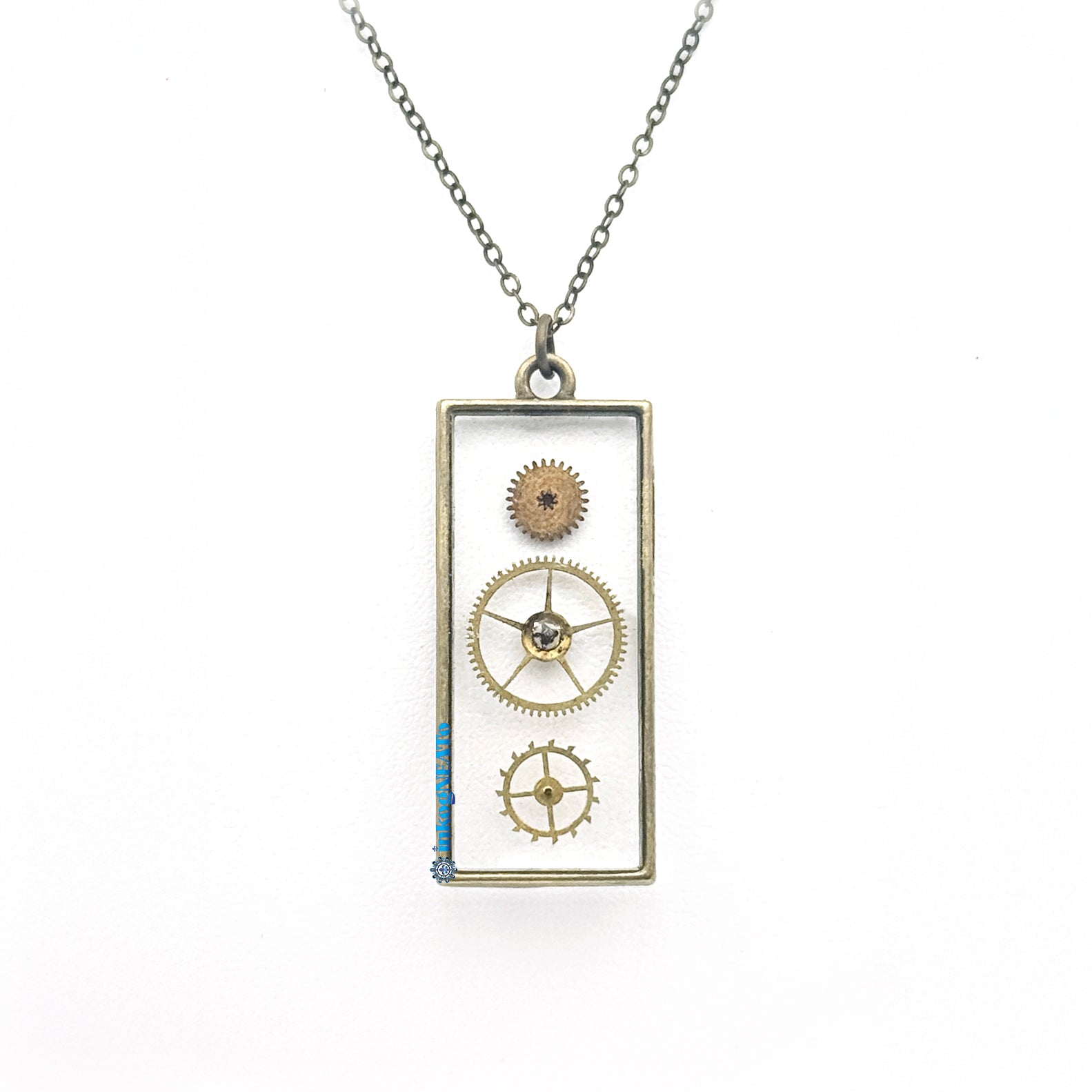 This pendant brings industrial elegance into focus with three distinct vintage gears— salvaged from old watches and clocks — suspended in resin. The piece hints at the idea that time, no matter how mechanical, still sparkles with possibility.