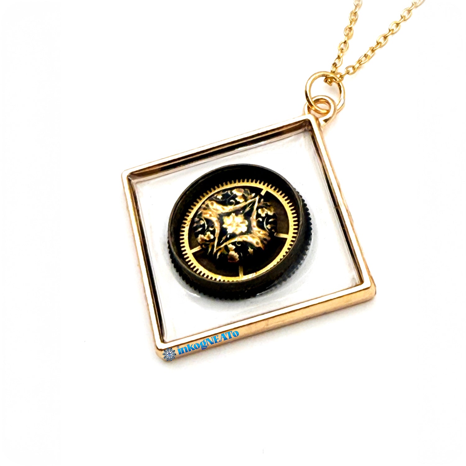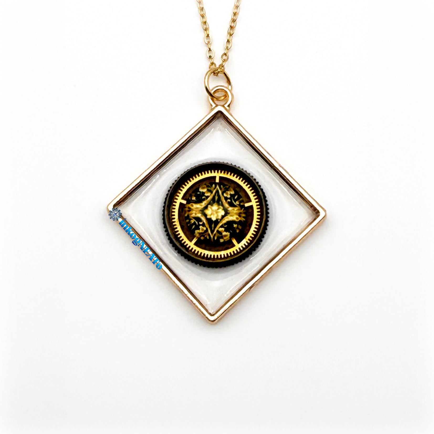 Like the inner workings of a forgotten timepiece, Timeless Fuse blends layered brass watch gears with the rich patina of an antique button, creating a relic that feels simultaneously mechanical and mythic. The stacked composition gives the illusion of motion frozen mid turn — an homage to the passage of time and the intricate beauty hidden in small, utilitarian parts. Set in a diamond-shaped brass bezel and finished with a coordinating chain, this piece is a statement of craftsmanship and quiet rebellion. It's the kind of necklace that doesn't whisper; it hums with history.