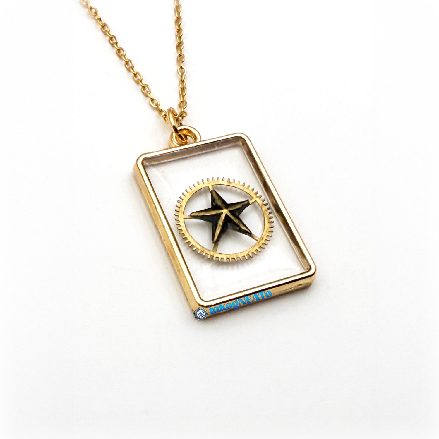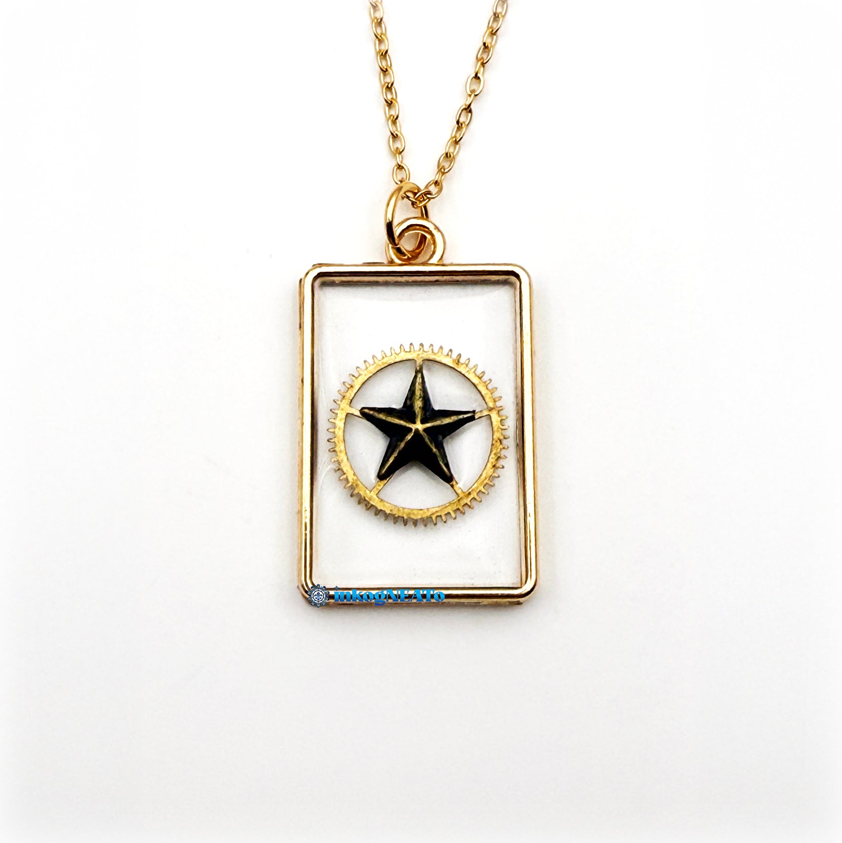 There’s something bold about a five-pointed star suspended in time. Starborn Mechanica captures that defiant energy — an antique dimensional star, salvaged from a forgotten relic, now commands the center of a brass clock gear. Encased in a rectangular bezel of warm brass tone, the piece gives off the feel of old Western badge meets futuristic talisman. It’s small but strong, a declaration rather than a decoration.