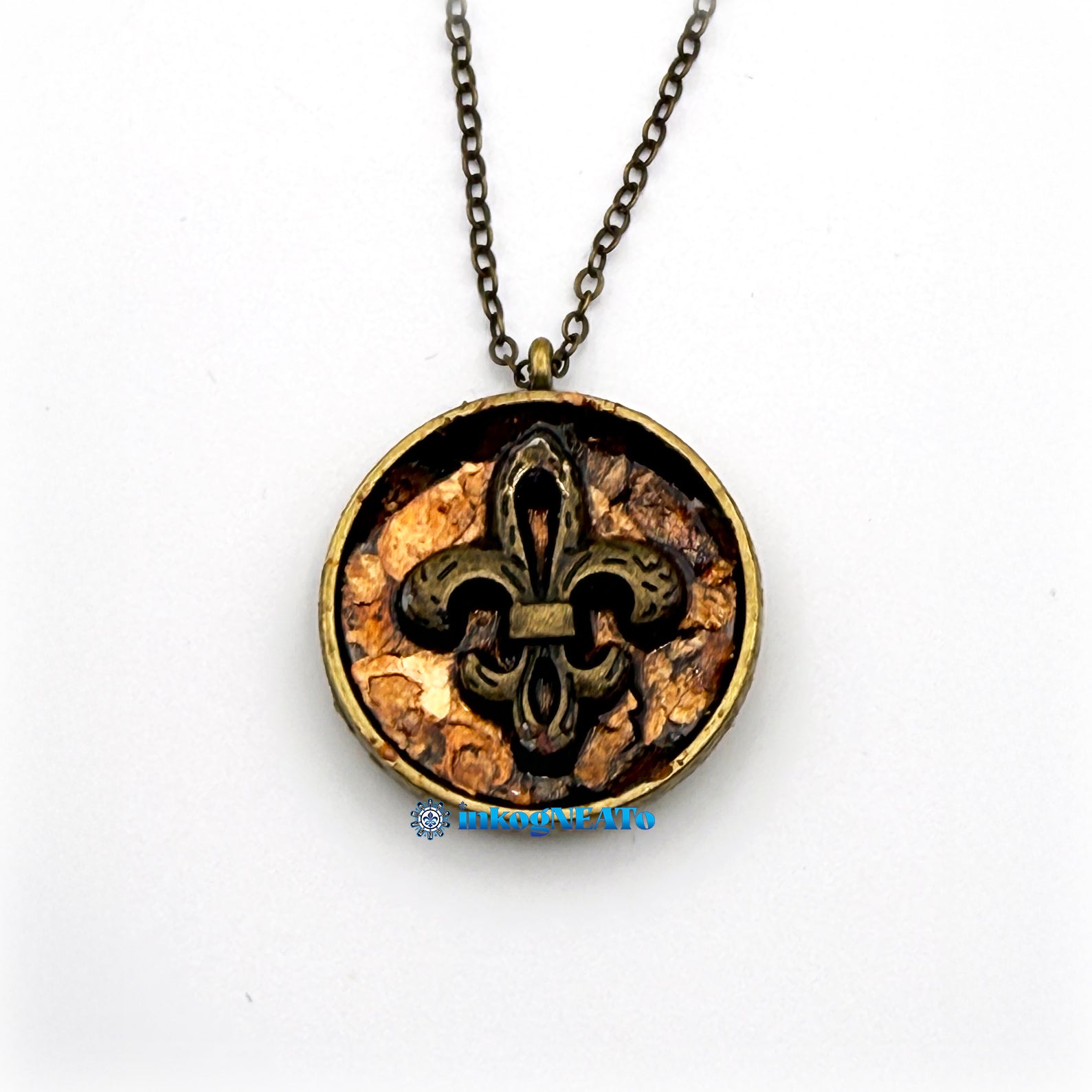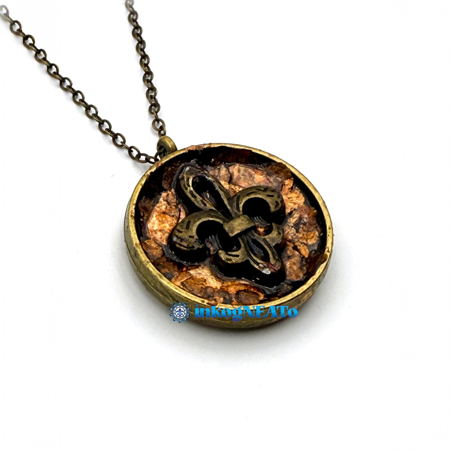 A nod to regal lineage and ornamental history, this one of a kind piece evokes the Old World elegance of French design with a contemporary, rough edged twist. A solid brass fleur de lys charm rises from a richly textured backdrop of copper mica flakes, their metallic glint shifting like molten earth beneath the surface. Encased in an antique brass bezel and sealed with clear resin, the effect is both medieval and modern — like a forgotten artifact unearthed from a steampunk reliquary.