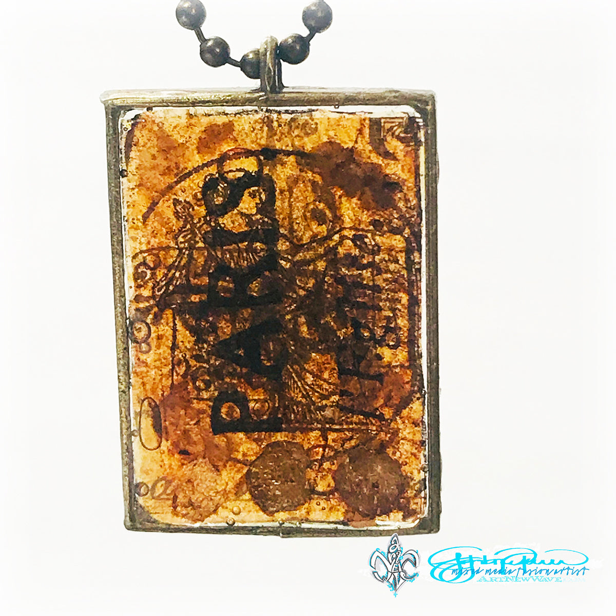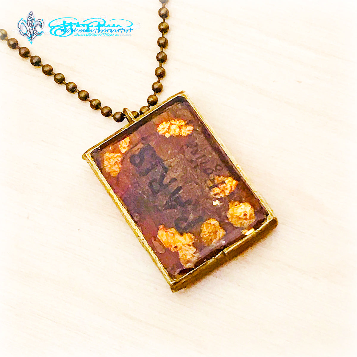 Always have a piece of Paris with you when wearing this layered, translucent Parisian inspired collage. The antique gold bezel features rich earth toned colors with metallic copper highlights with layered text. This bezel measures 1 x 1⅜ inches (2.5 x 3.5 cm), hanging from an antique gold ball chain measuring 22 inches (56 cm) in length.