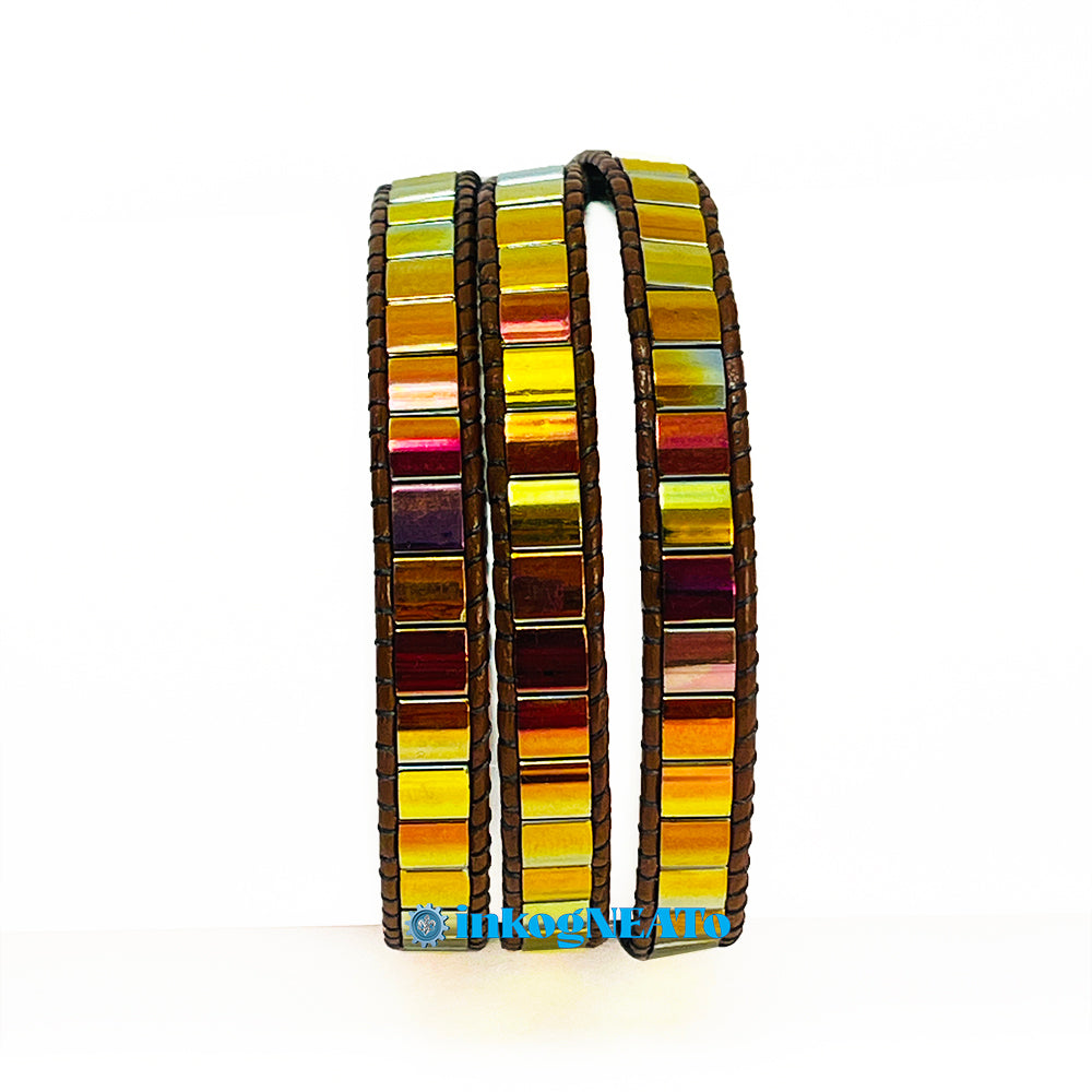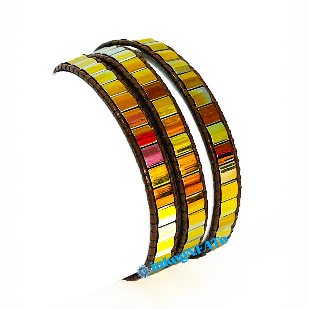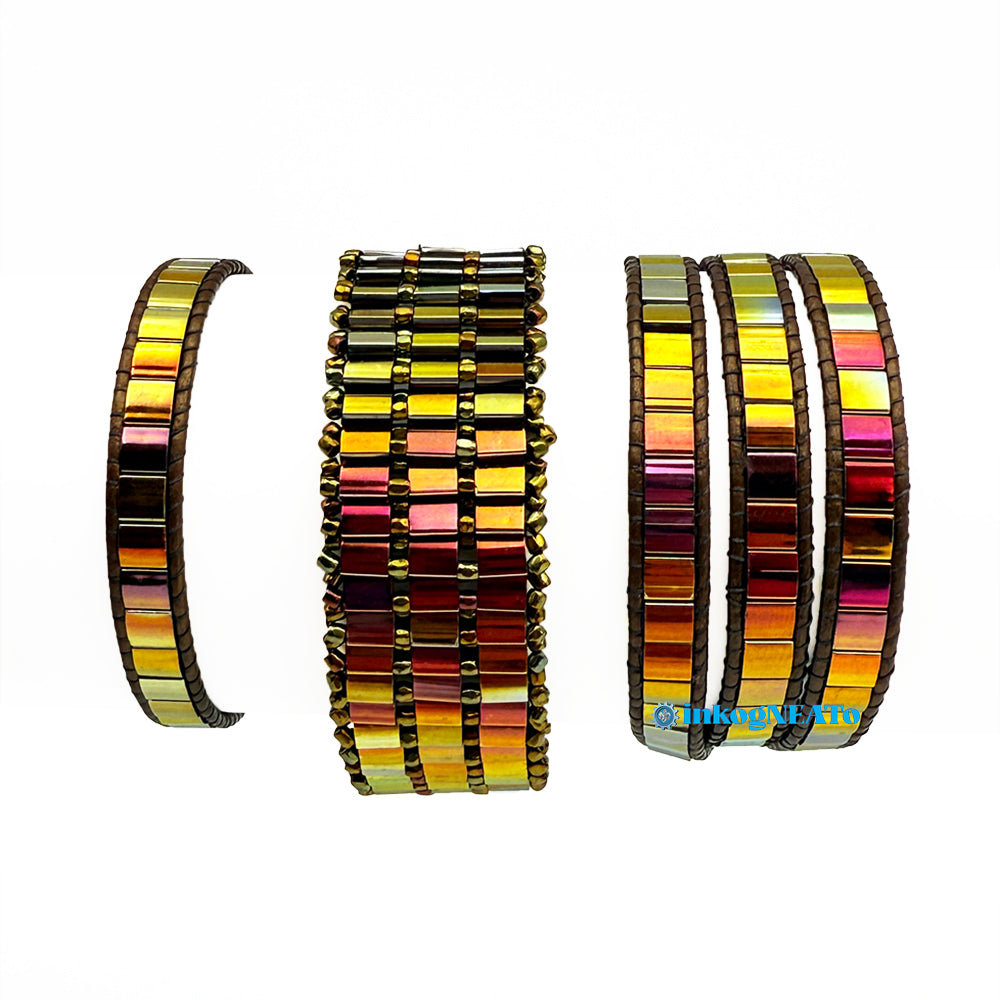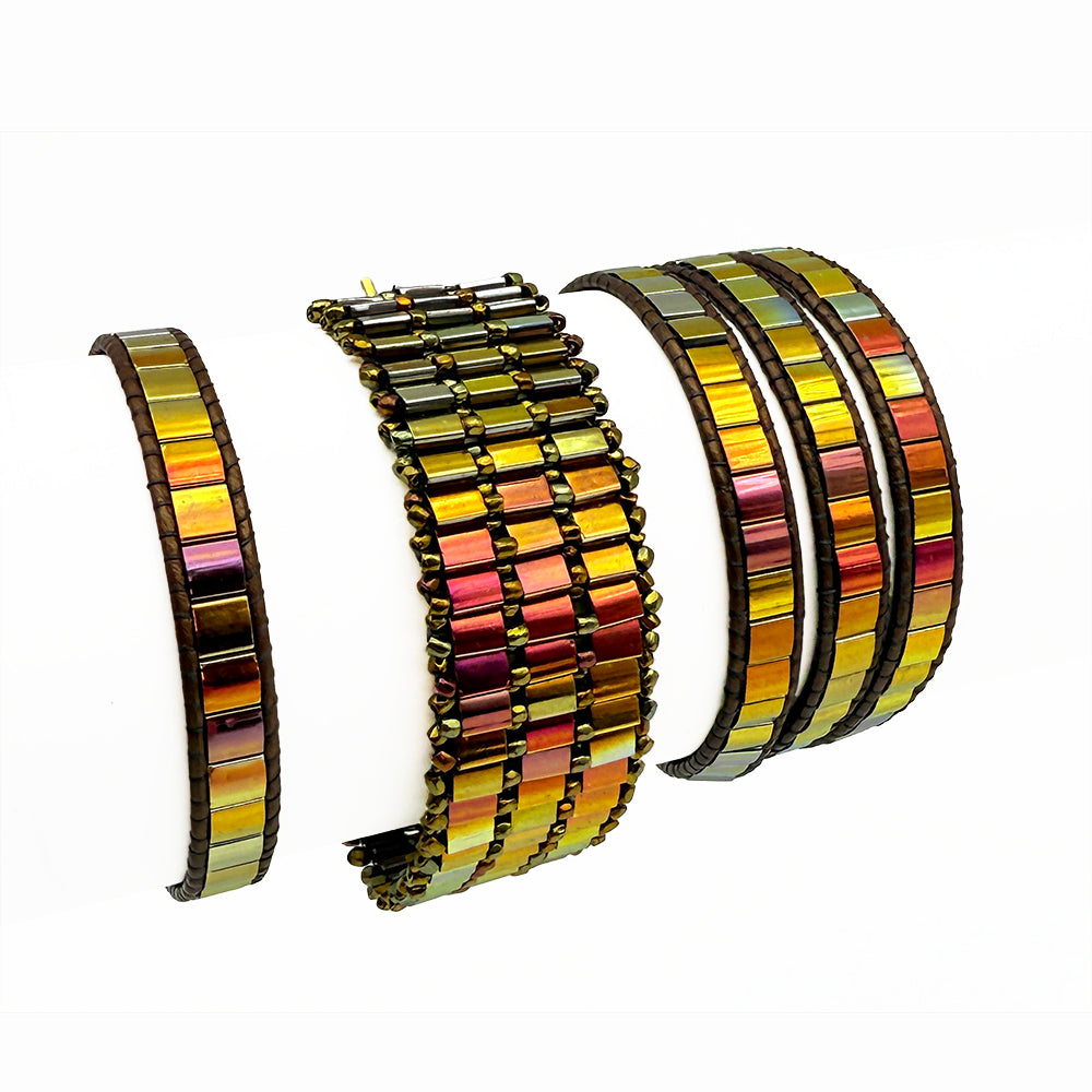 TILTED BRACELETS feature layered Tila beads, giving them a "tilted" appearance because of the way they stack upon one another. Designed to resemble a cuff, these bracelets feature a claw clasp and jump rings to allow for sizing versatility. Tilted style bracelets are named for how many rows of tila beads make the bracelet : Single (1 row), Double (2 rows) or Triple (3 rows).