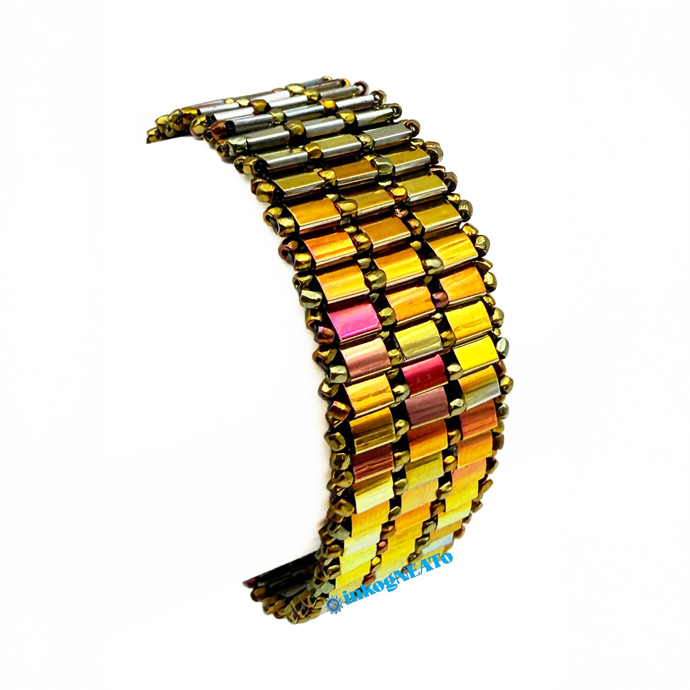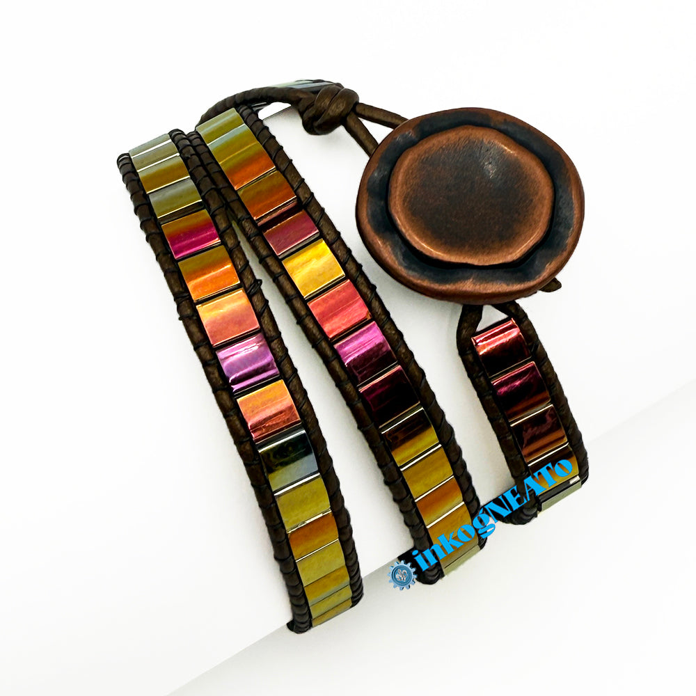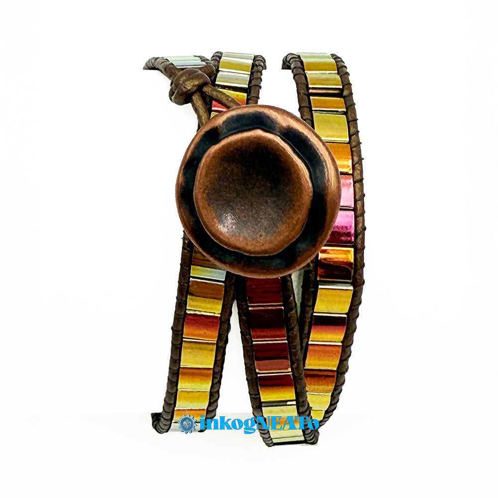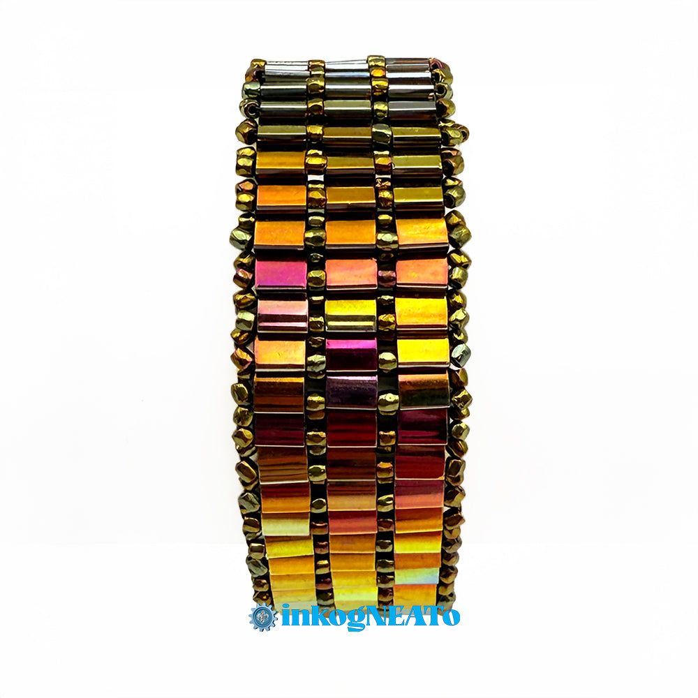 TILTED BRACELETS feature layered Tila beads, giving them a "tilted" appearance because of the way they stack upon one another. Designed to resemble a cuff, these bracelets feature a claw clasp and jump rings to allow for sizing versatility. Tilted style bracelets are named for how many rows of tila beads make the bracelet : Single (1 row), Double (2 rows) or Triple (3 rows).