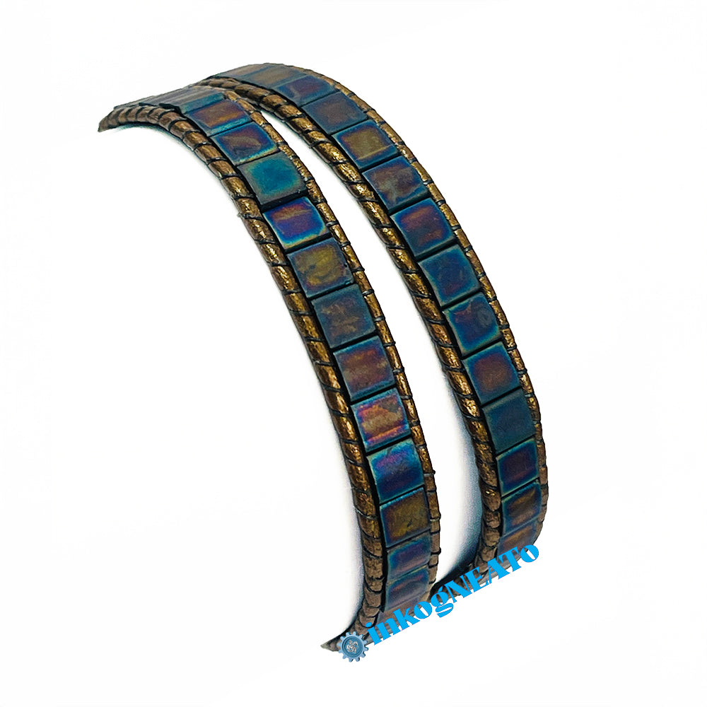 TILTED BRACELETS feature layered Tila beads, giving them a "tilted" appearance because of the way they stack upon one another. Designed to resemble a cuff, these bracelets feature a claw clasp and jump rings to allow for sizing versatility. Tilted style bracelets are named for how many rows of tila beads make the bracelet : Single (1 row), Double (2 rows) or Triple (3 rows).