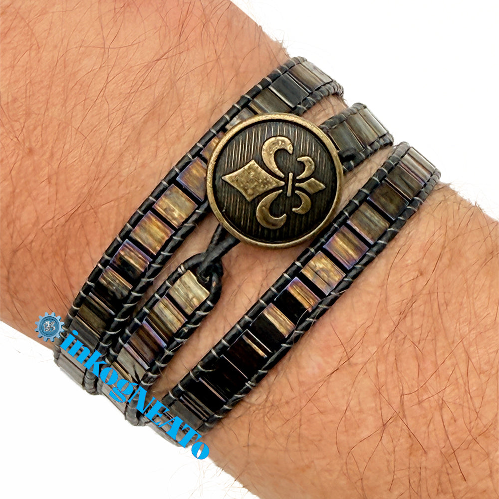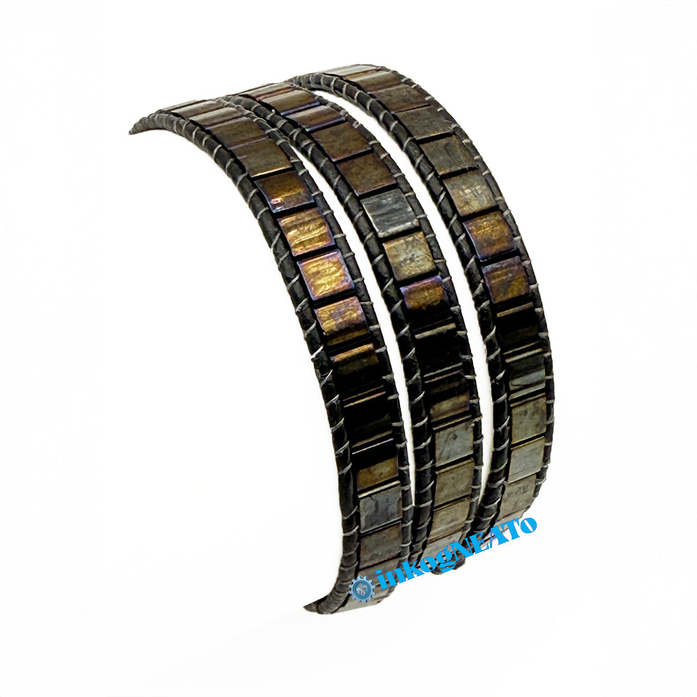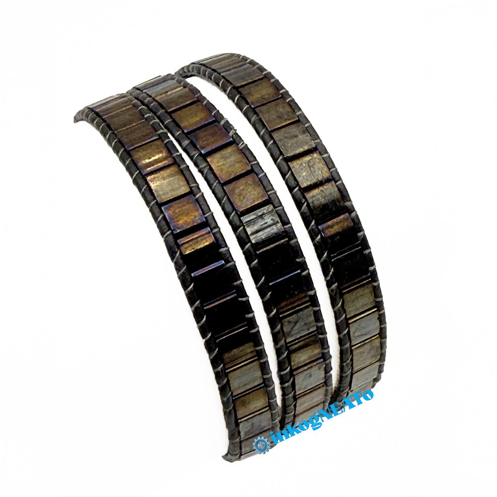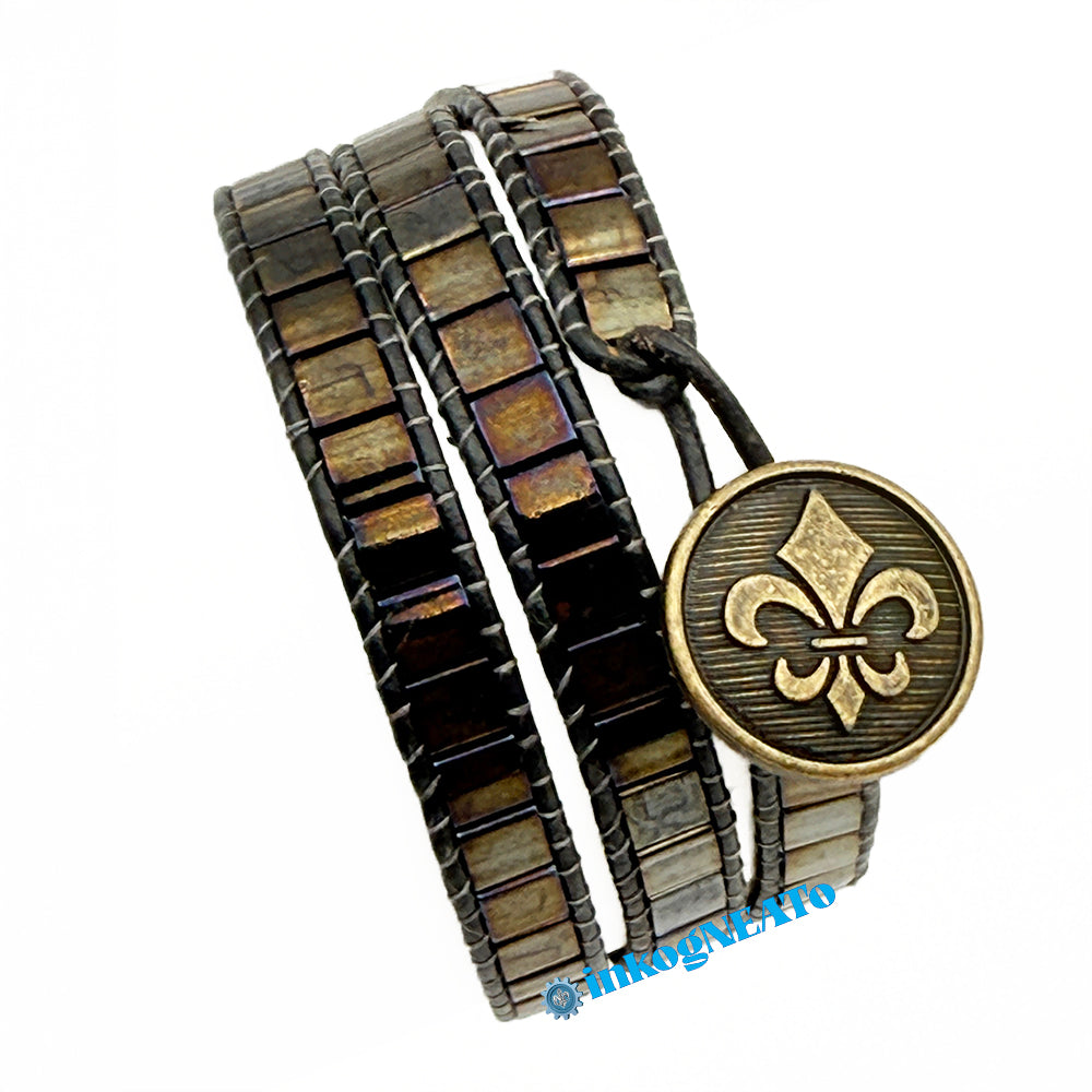 TILTED BRACELETS feature layered Tila beads, giving them a "tilted" appearance because of the way they stack upon one another. Designed to resemble a cuff, these bracelets feature a claw clasp and jump rings to allow for sizing versatility. Tilted style bracelets are named for how many rows of tila beads make the bracelet : Single (1 row), Double (2 rows) or Triple (3 rows).