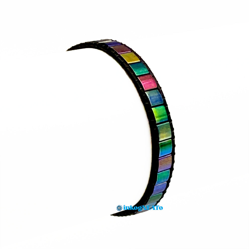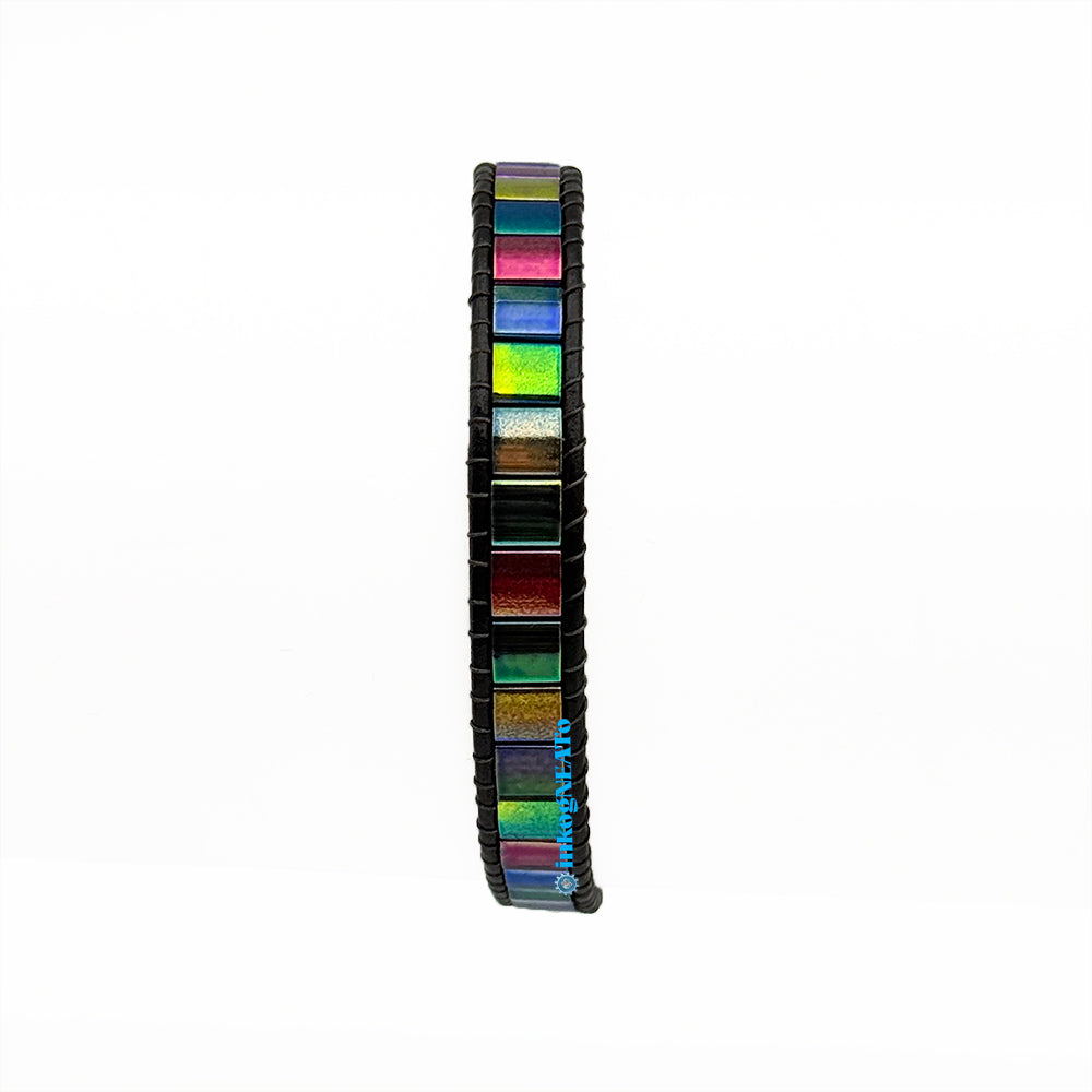 Construction: Multicolored iridescent Tila beads with ranging in color from green and magenta to purple and metallic tones on black leather cord with a button closure. As with all handcrafted work, slight variations are part of the process and contribute to the individuality of each bracelet.