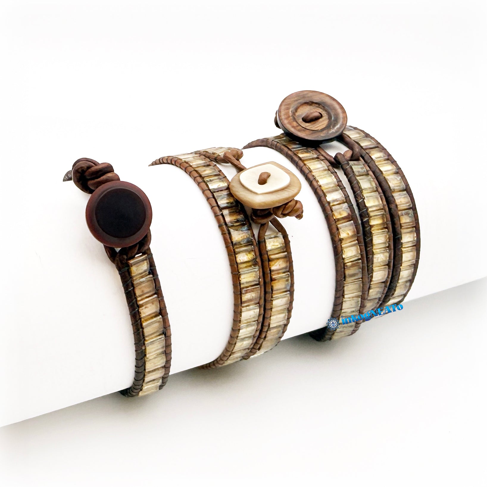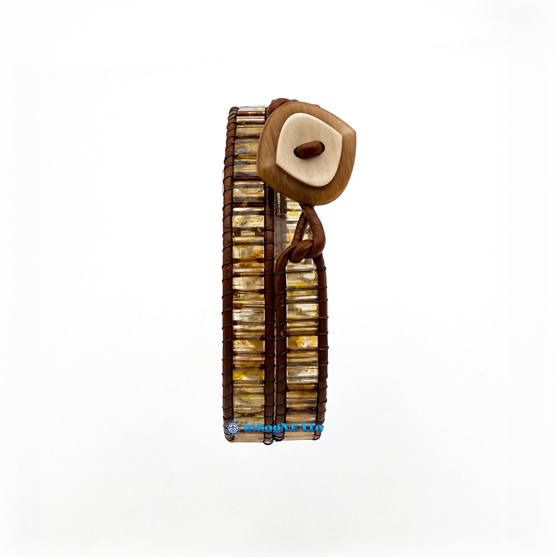 Construction: Translucent marbled Tila beads with colors ranging from earthy yellow to brown with amber highlights on brown leather cord with a button closure. As with all handcrafted work, slight variations are part of the process and contribute to the individuality of each bracelet.